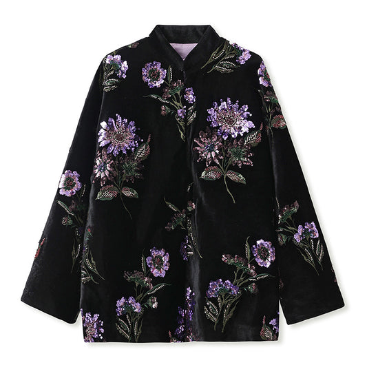 Luxury Floral Sequin and Feather Embellished Black Velvet Jacket SAM902
