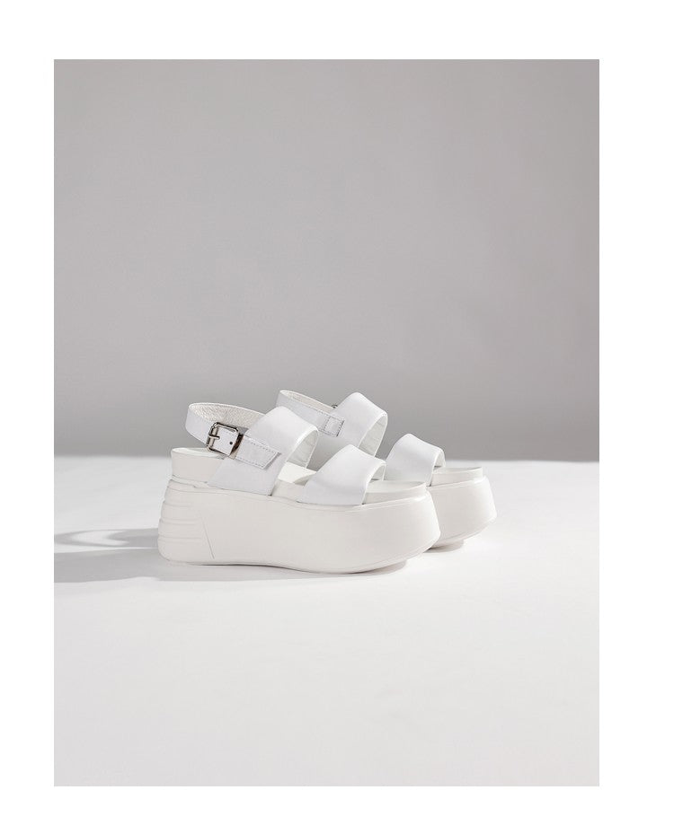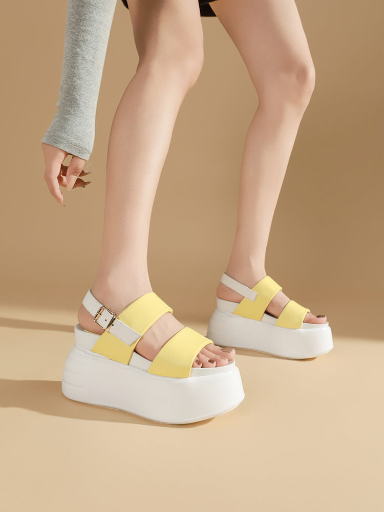 Elevate your style with these trendy platform sandals featuring vibrant yellow straps and a secure white ankle strap. The thick white platform sole adds height and a fashionable edge to any outfit.