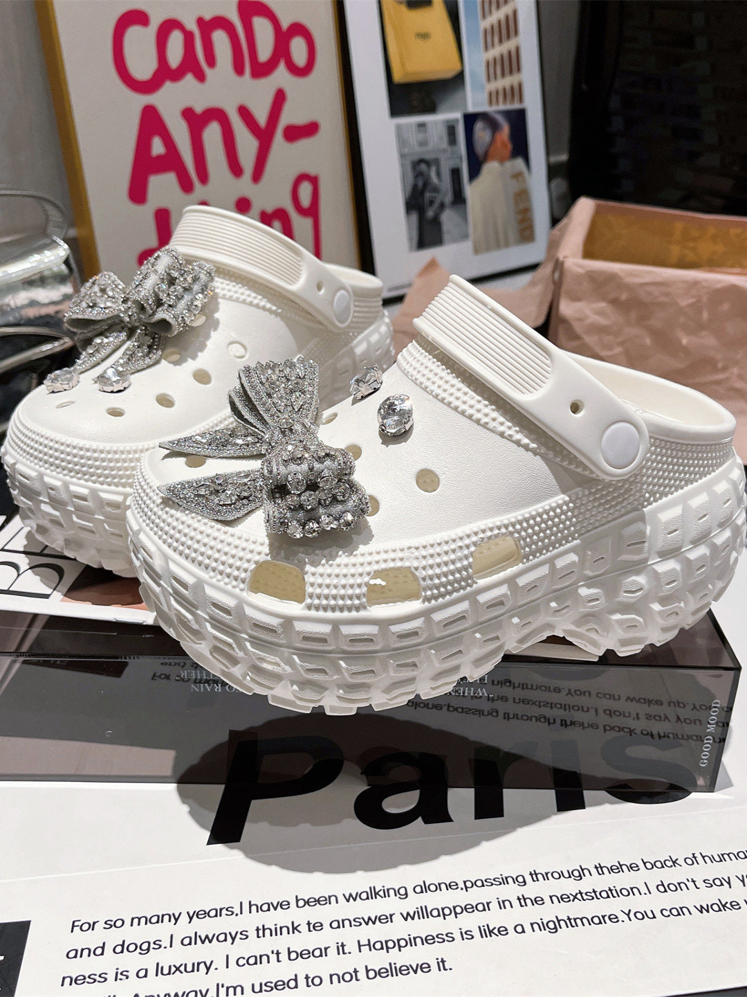 hese are platform clog-style shoes, likely a collaboration similar to Crocs, featuring a chunky, ridged platform sole and a back strap. The shoes are predominantly white and are heavily embellished with sparkly, oversized bow appliqués on the vamps. There are also smaller, scattered gemstone or stud details across the upper. The overall aesthetic is a blend of casual comfort and high-fashion embellishment, creating a statement footwear piece.