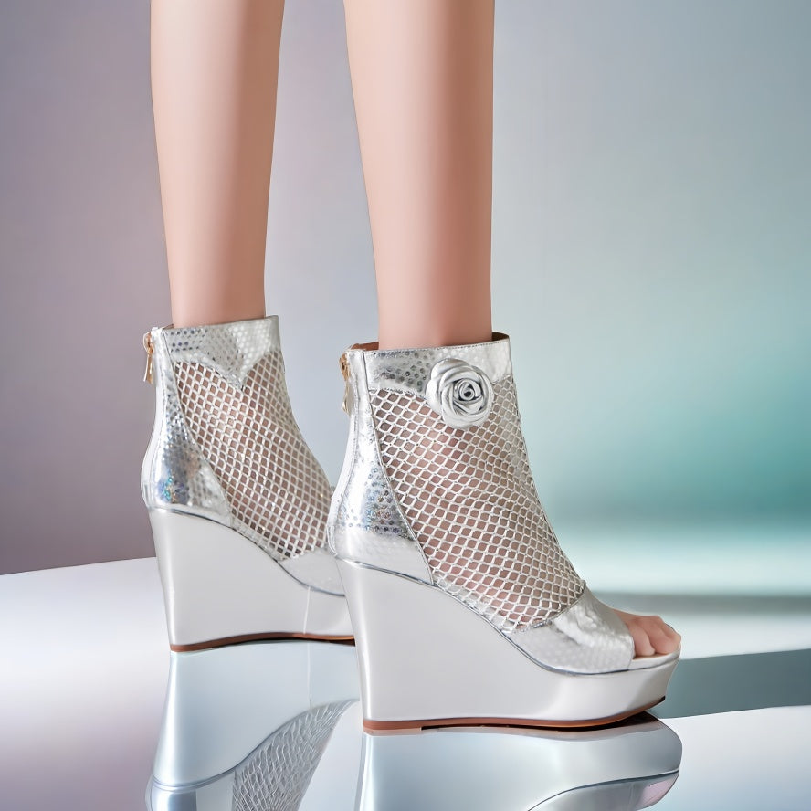 A pair of golden, peep-toe wedge heels with a mesh upper and a decorative rose detail are showcased on a reflective surface. The shoes feature a high, solid wedge heel and a platform sole, both in a matching gold tone. The mesh material forms the main body of the shoe, enclosing the foot up to the ankle, with a zipper closure visible at the back of the heel. A delicate, sculpted rose adorns the side of each shoe near the ankle opening. The shoes are worn by a person whose legs are visible from the mid-thigh down. One leg is bent at the knee, with the foot elevated slightly off the reflective surface, while the other leg is positioned with the foot resting on the surface, showcasing the shoe's profile. The reflective surface creates a mirrored image of the shoes and the lower portion of the legs. The background is a soft, gradient grey, drawing focus to the footwear.![]()