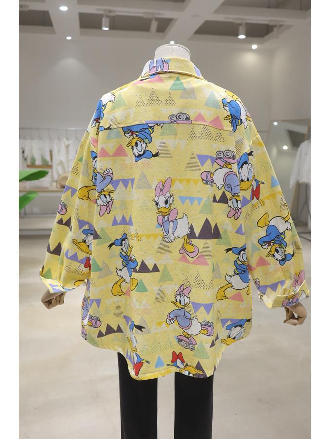playful style with this vibrant yellow oversized shirt featuring an all-over print of beloved Disney characters, Donald and Daisy Duck. This comfy and casual top is perfect for adding a touch of fun to your everyday wardrobe. Made from a lightweight fabric, it's ideal for a relaxed fit and can be layered or worn on its own.