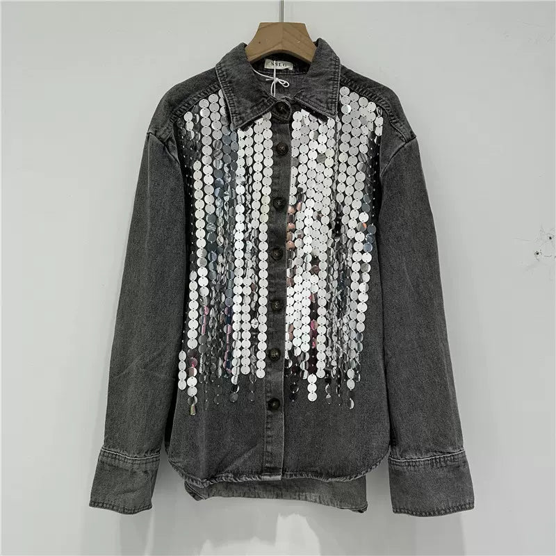 Design heavy sequined street-blasting denim shirt for women 2024 spring new loose shirt oversized Denim Jacket shirt