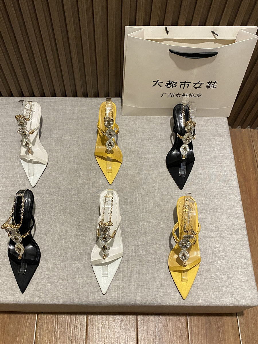 Elegant Black Pointed-Toe Heels with Gold Chain and Rhinestone Detail heel sandals SAM671
