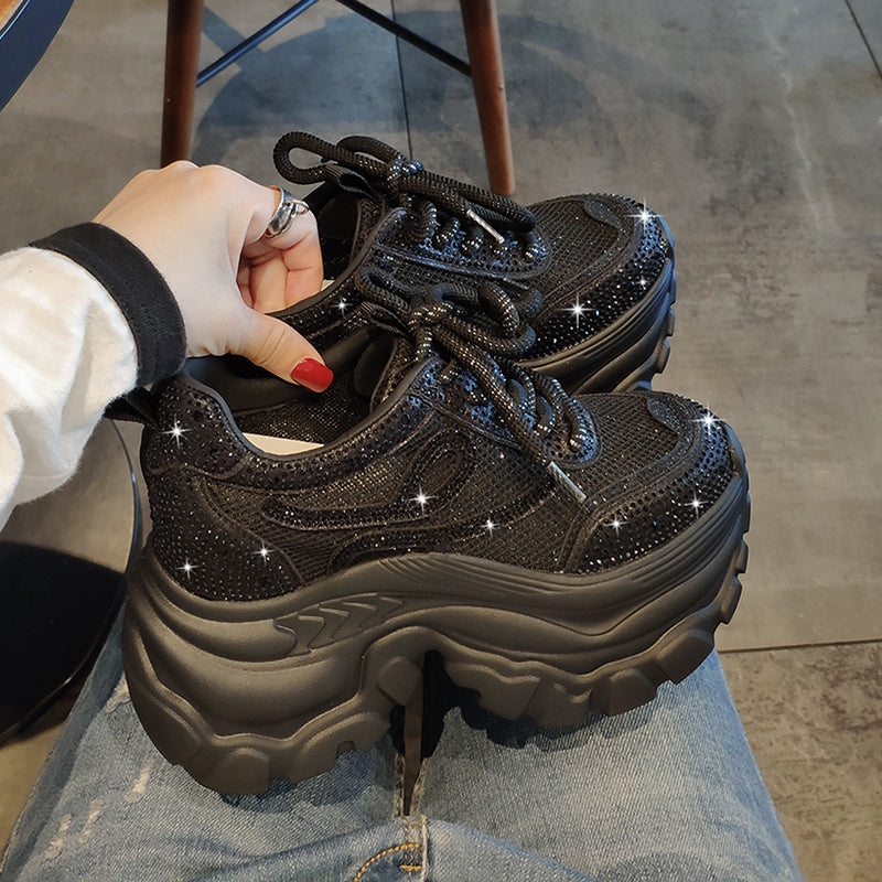 DazzleWalk Sparkle Sneakers. These trendy platform shoes feature eye-catching glitter and a comfortable chunky sole, perfect for adding a touch of sparkle to any outfit. Available in white and black, these fashion-forward sneakers are designed for those who love to shine.