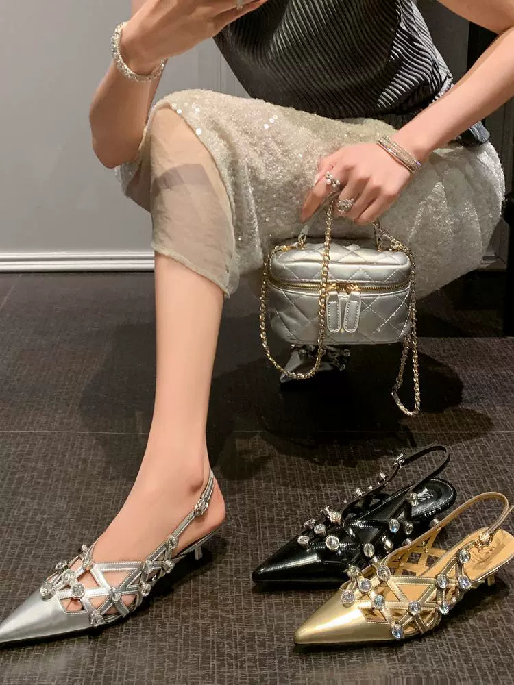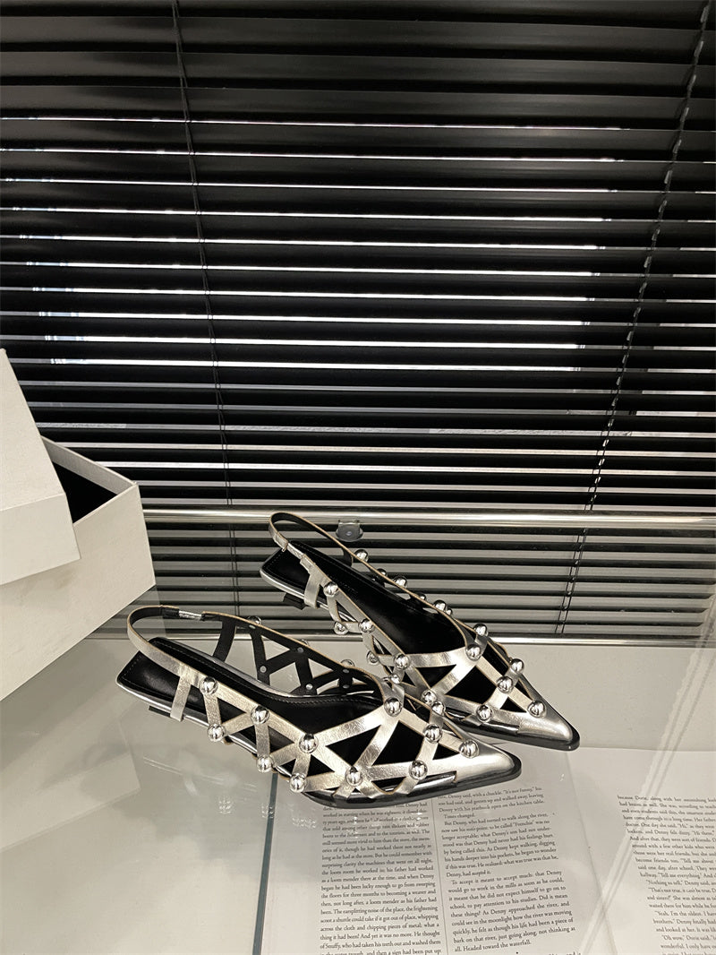 Kitten Heels style simple niche rivet hollow pointed shallow mouth stiletto back empty closed toe pumps heel belly