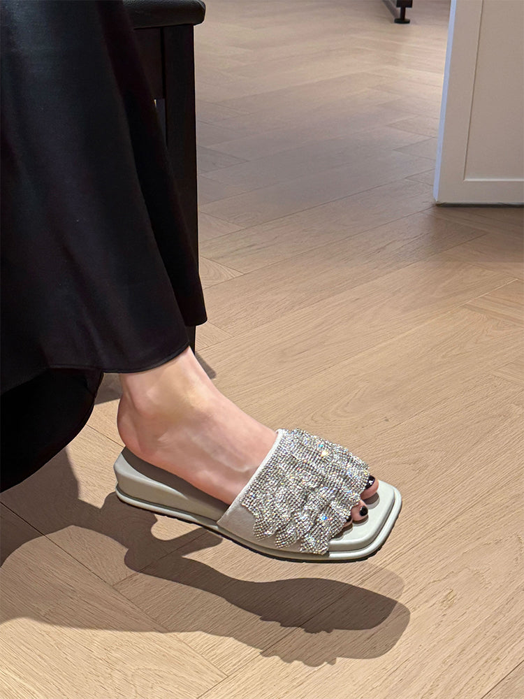 Step out in shimmering style with these elegant square-toe slide sandals. Featuring a comfortable flat platform sole in a chic light grey or off-white, these slip-on mules are adorned with a dazzling, multi-row rhinestone fringe upper, adding a touch of glamour to any ensemble. Perfect for both casual wear and dressing up.