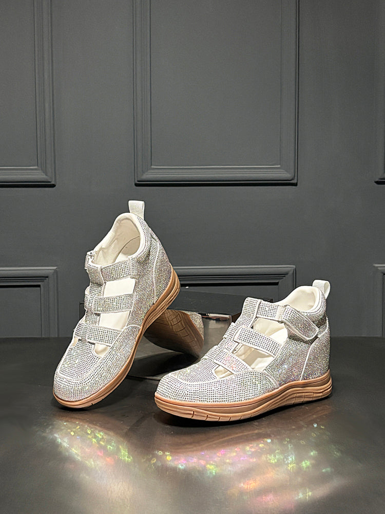 Rhinestone-embellished wedge sneakers. Featuring three adjustable hook-and-loop straps for a secure and comfortable fit, these chic high-top sneakers are perfect for adding a touch of glamour to any casual or party ensemble. The elevated wedge sole provides a flattering lift while ensuring all-day comfort.