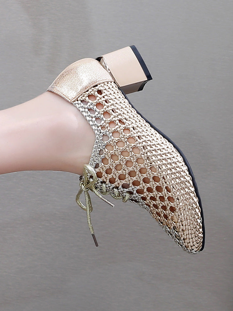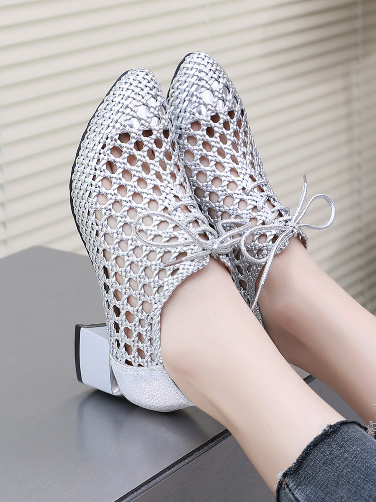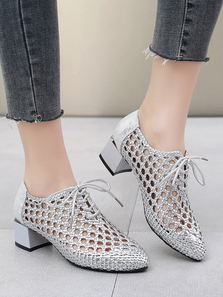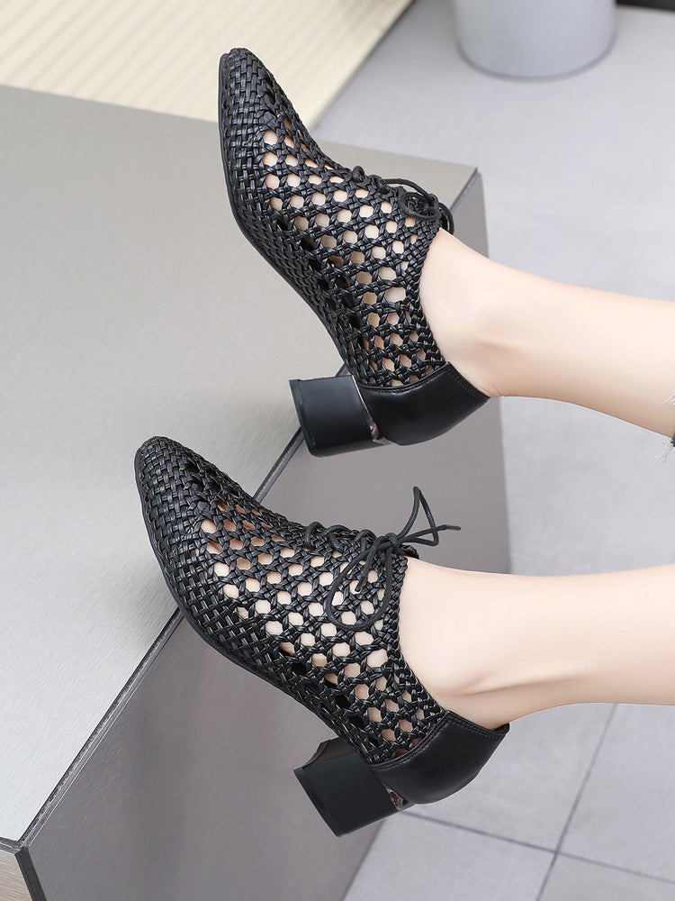 comfort with these woven mesh point-toe shoes. Featuring a breathable, intricate lattice design across the upper and a chic block heel, these lace-up shoes offer a blend of modern style and airiness. Perfect for warm weather office wear or stylish casual outings.