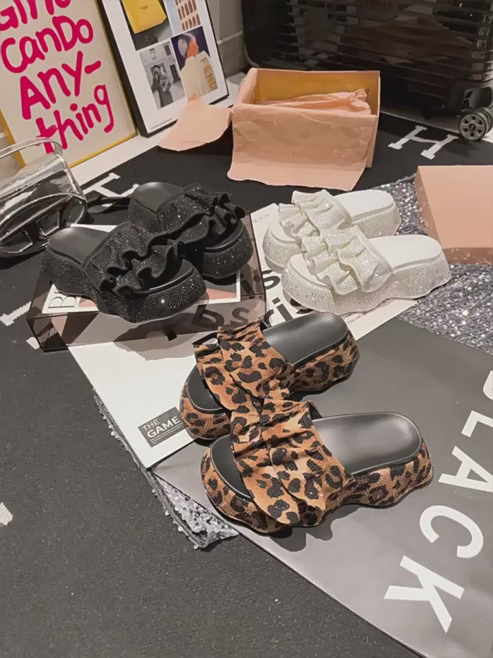 summer rhinestones full-diamond ruffle-edged thick-soled sponge cake one-line sandals with leopard print shoes flip flop for women SAM301