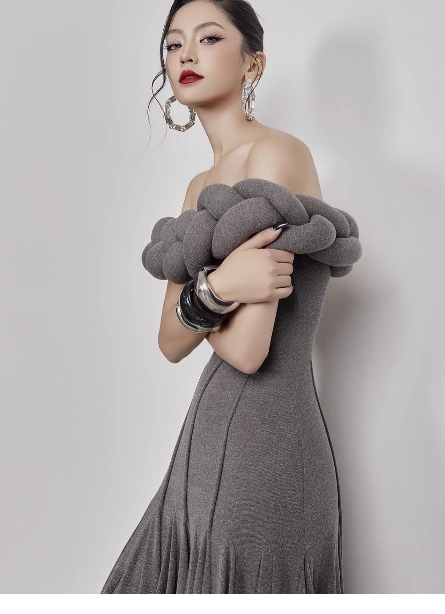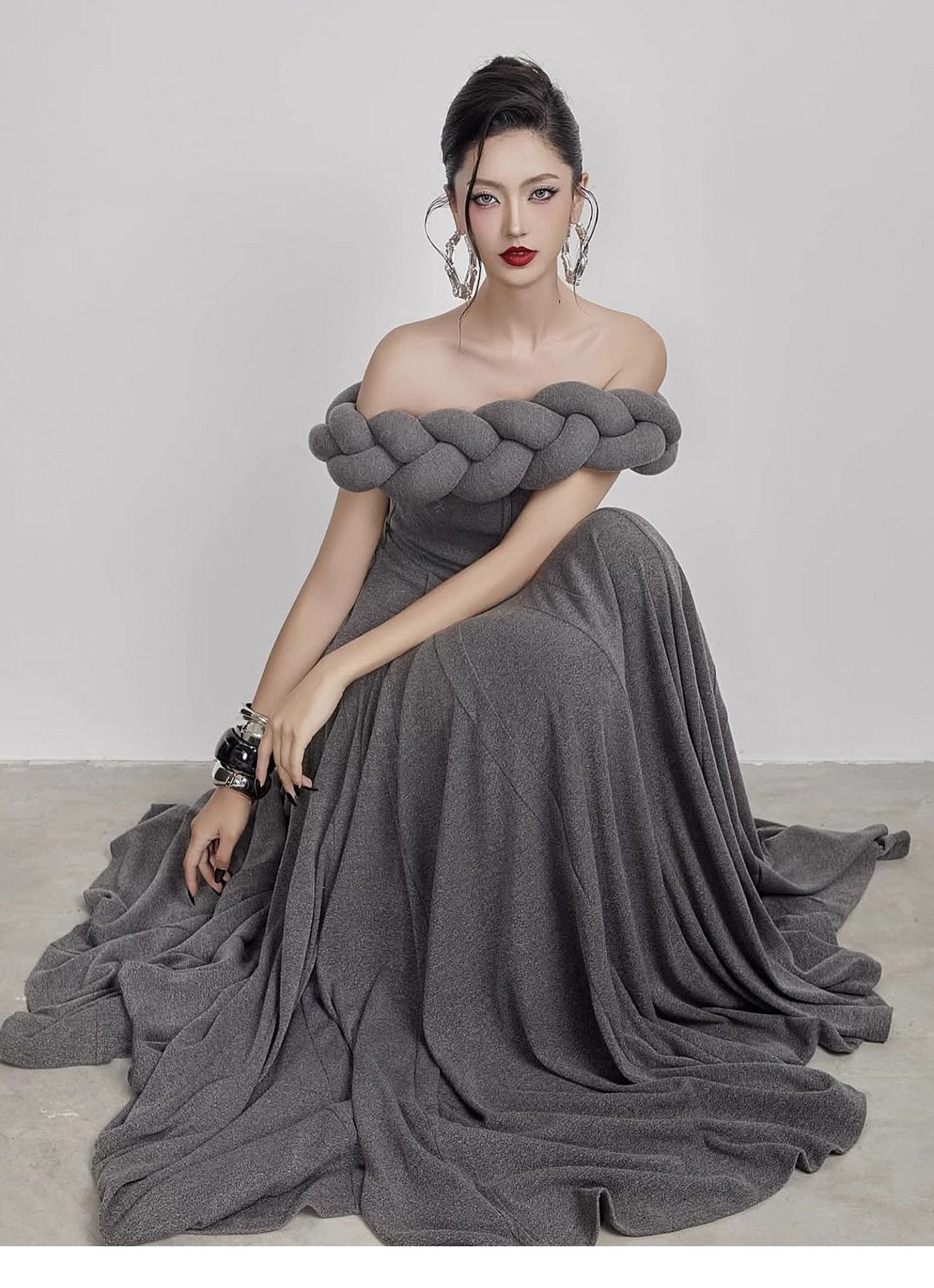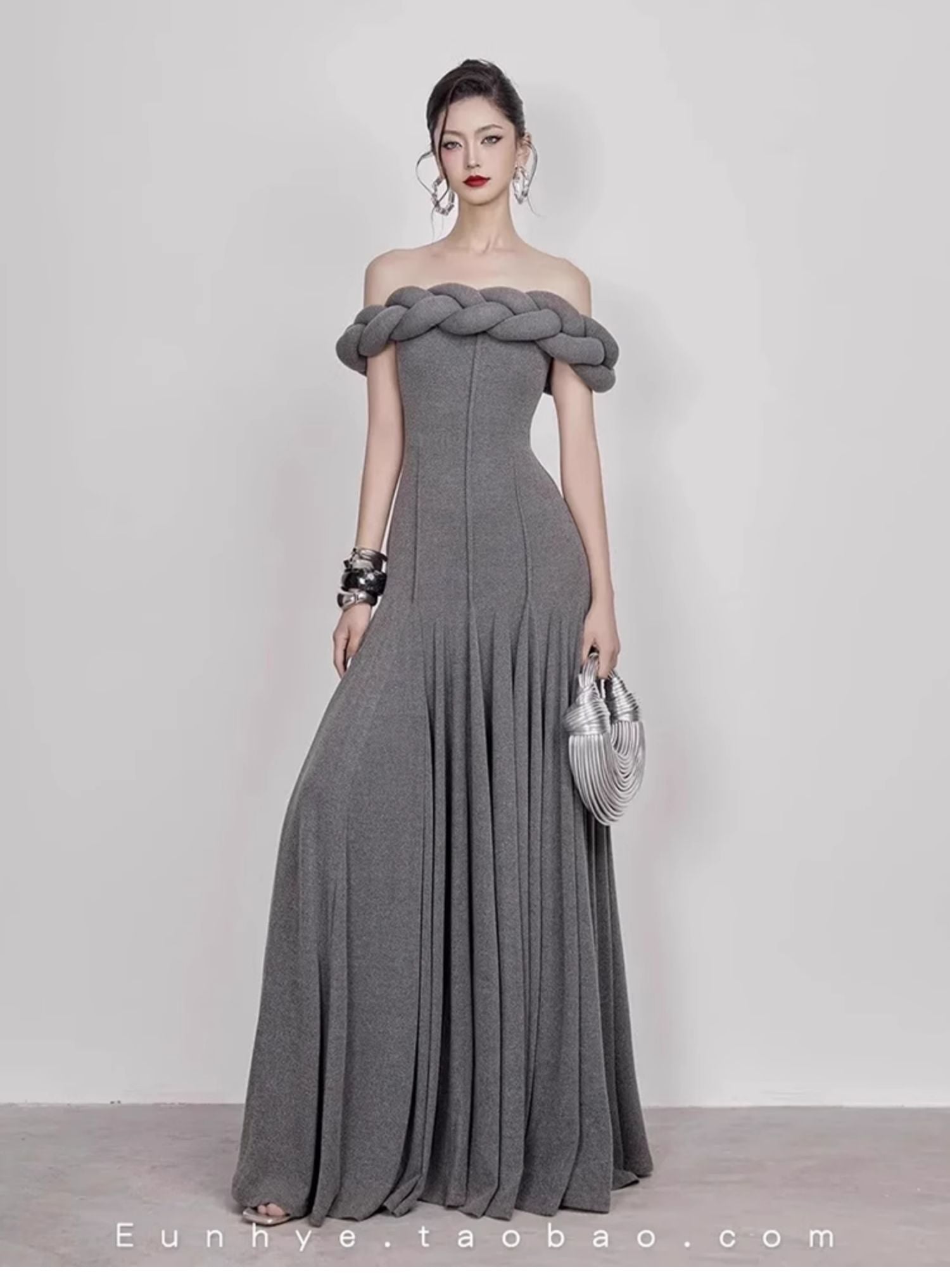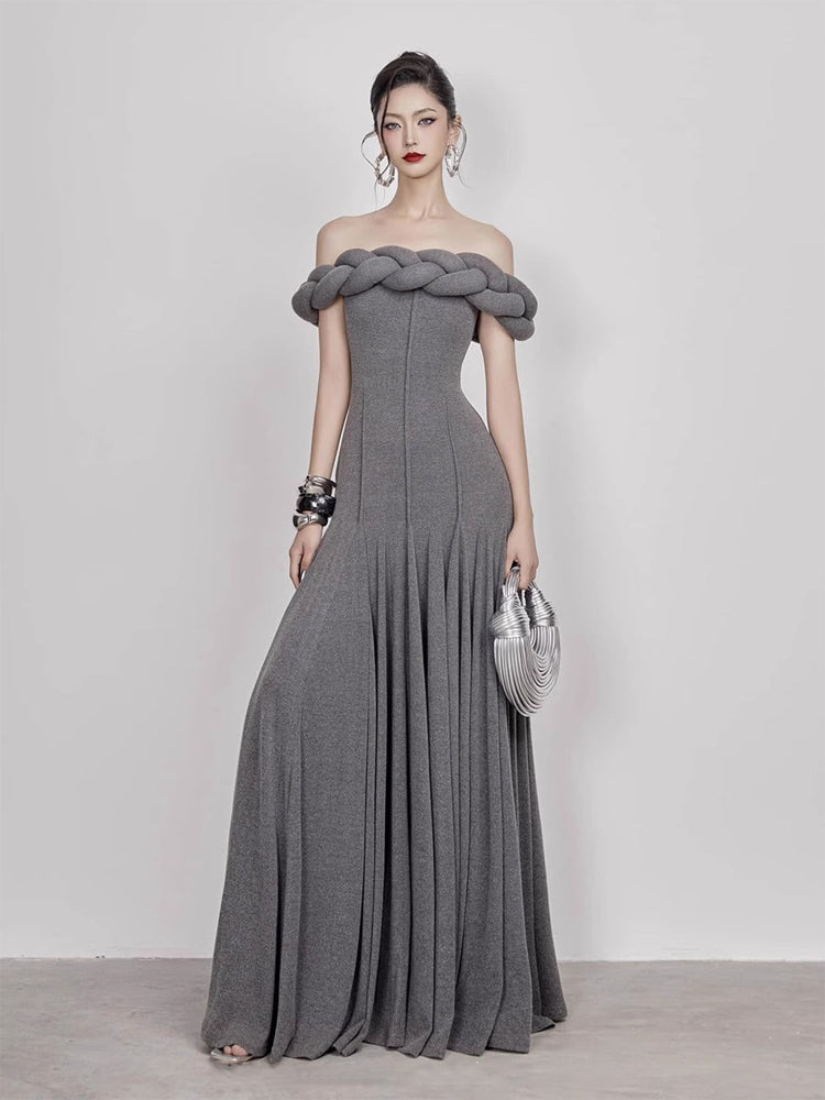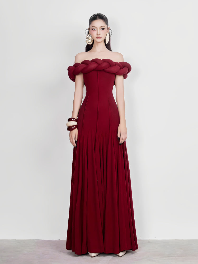 This striking, full-length gown features an elegant off-the-shoulder design with a unique braided detail along the neckline. The fitted bodice accentuates the figure, flowing into a graceful, floor-length skirt. The rich, deep red fabric adds a touch of drama and sophistication. Perfect for formal events, galas, or any occasion where you want to make a lasting impression.