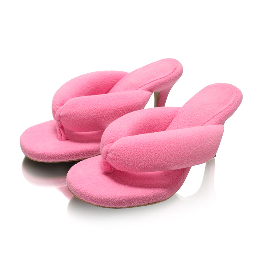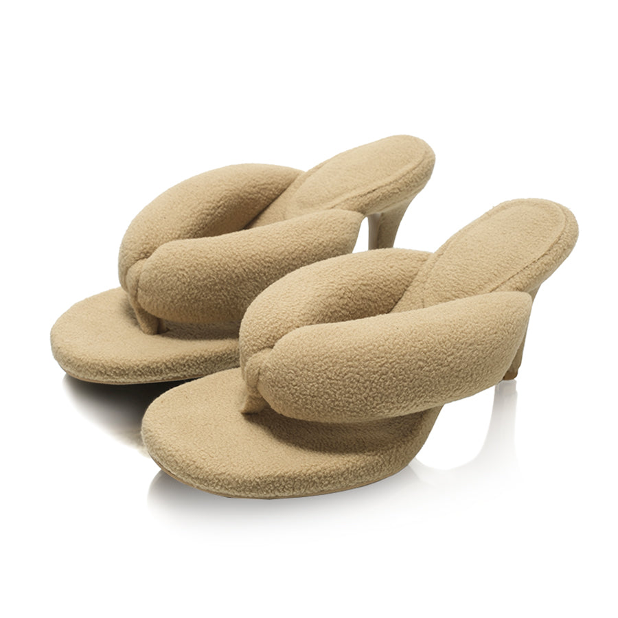 Unique and stylish high-heeled mules featuring a soft fleece material and a distinctive twisted strap design. These slip-on sandals are a fashionable statement piece.